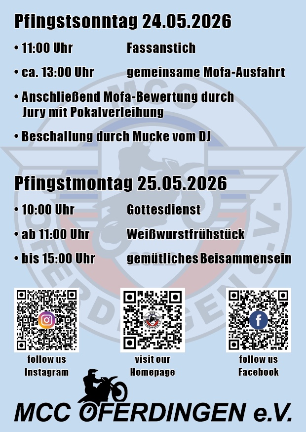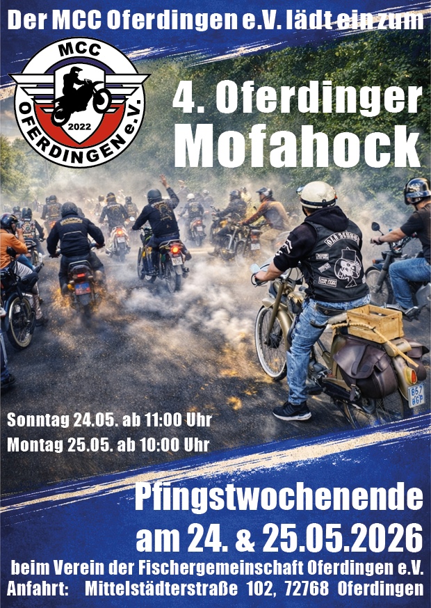 Liebe Mofafreunde, Zweitakt-Enthusiasten und Festbegeisterte, der MCC Oferdingen lädt euch herzlich zum 4. Oferdinger Mofahock ein! Am 24. und 25. Mai 2026 verwandelt sich Oferdingen wieder in einen Treffpunkt für alle, die Benzin im Blut und Freude an geselliger Atmosphäre haben. Freut euch auf ein abwechslungsreiches Wochenende mit: gemütlichem Beisammensein unter Gleichgesinnten knatternden Mofas und Fachsimpelei rund um Zweiräder leckeren Speisen und kühlen Getränken guter Musik und bester Stimmung Egal ob mit eigenem Mofa, als Schrauber, Zuschauer oder einfach als Gast – bei uns ist jeder herzlich willkommen! Kommt vorbei, bringt eure Freunde mit und erlebt ein Wochenende voller Leidenschaft, Spaß und Gemeinschaft! Wir freuen uns auf euch! Mit freundlichen Grüßen MCC Oferdingen