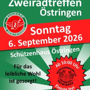 Bereits zum siebten Mal wird am Sonntag, den 06. September 2026 das Zweiradtreffen Östringen der Zündapp IG Östringen und der Schützengilde e.V. 1927 Östringen rund um das Schützenhaus Östringen stattfinden. Beliebter Treffpunkt für Oldie-Fans und Ausflugsziel für die gesamte Familie lockten in den letzten Jahren zahlreiche Besucher an. Für das leibliche Wohl wird wieder Bestens gesorgt sein.