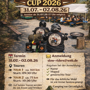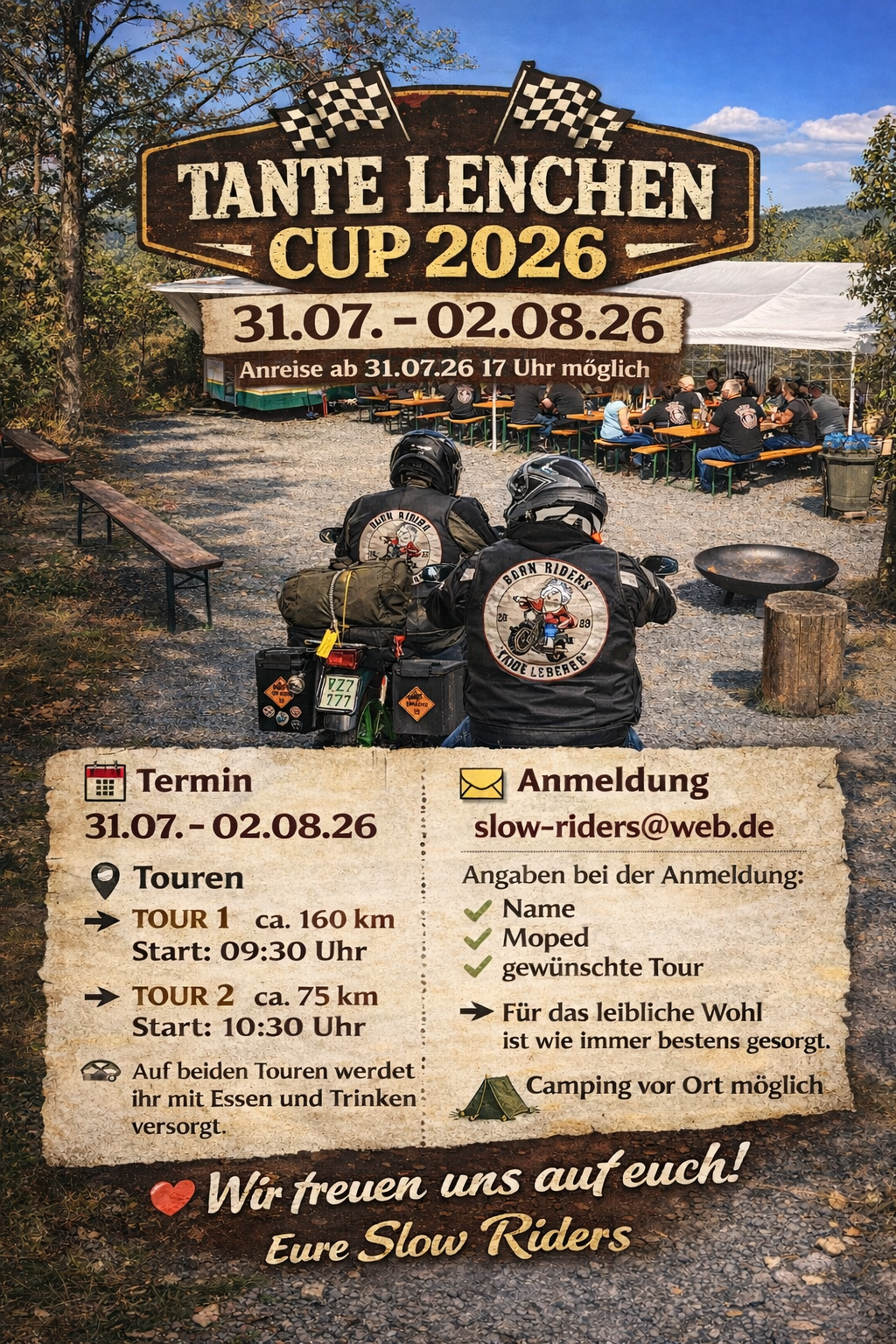 Wir die Slow Riders Tante Lenchen veranstalten in diesem Jahr wieder unseren beliebten Tante Lenchen Cup – allerdings nicht wie gewohnt am 03.Oktober, sondern vom 31.07-02.08.26 hoffentlich bei deutlich angenehmeren Temperaturen 🌞🏍