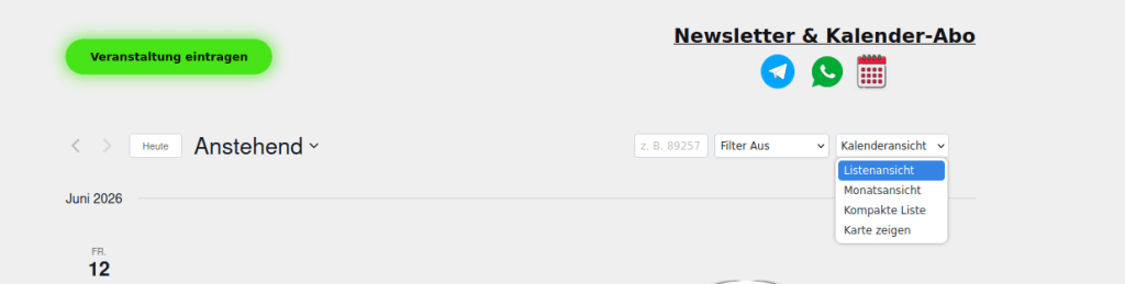 • Auf der Startseite oder Eventseite das Kalendersymbol unter „Newsletter & Kalender-Abo“ anklicken.