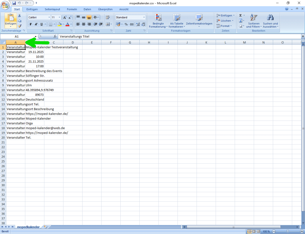 • Nach der ersten Eintragung bekommst du eine E-Mail mit der URL und einer vorbereiteten mopedkalender.csv.