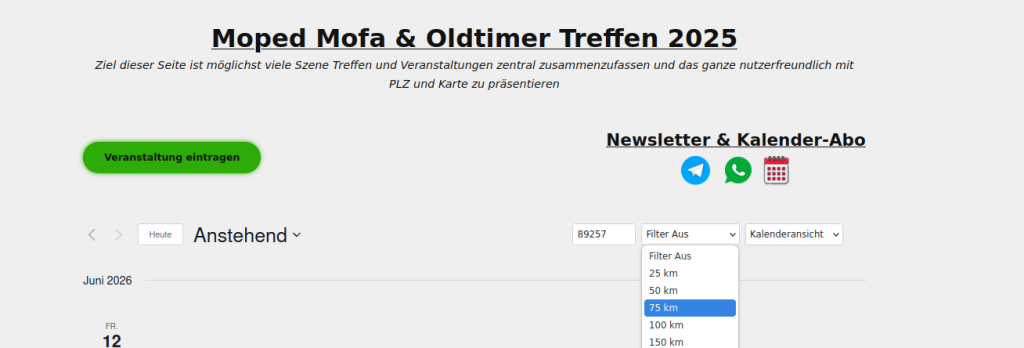 Hier findest du bebilderte Schritt-für-Schritt-Erklärungen zu den wichtigsten Funktionen des Moped-Kalenders. Wenn du von der FAQ-Hauptseite kommst, wird dir normalerweise direkt der passende Abschnitt angezeigt. Du kannst aber auch unten im Inhaltsverzeichnis ein Thema auswählen.