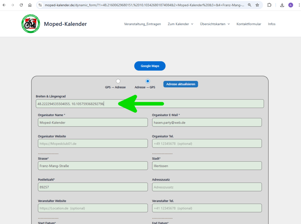 • GPS und Adressdaten sind die gleichen wie bei eurer 1. oder letzten Eintragung. Nur ändern wenn ihr den Veranstaltungsort verlegt habt