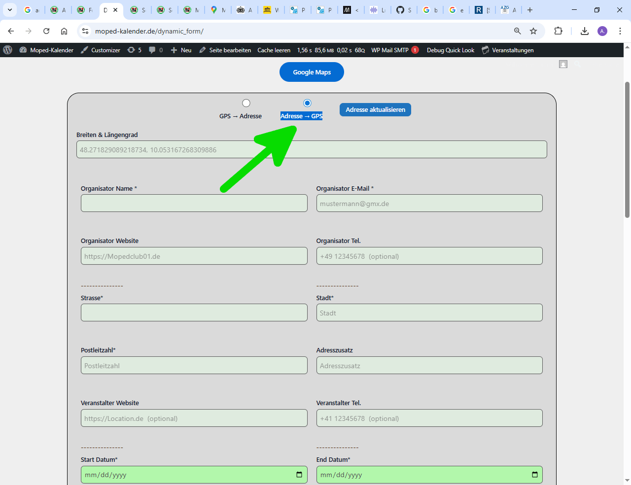 • Über dem Formular siehst du den blauen Button für Google Maps.