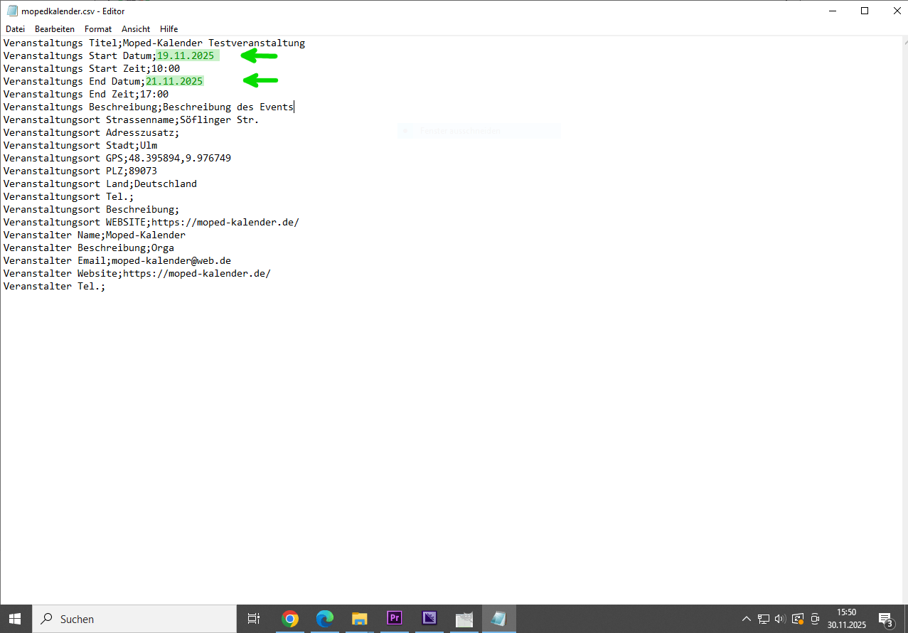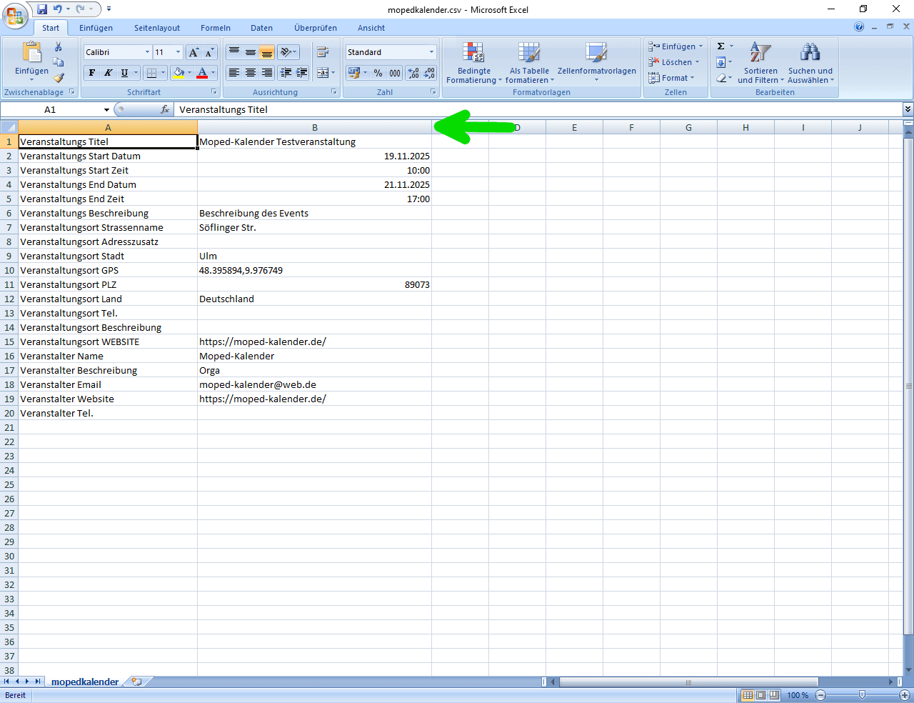• Nach der ersten Eintragung bekommst du eine E-Mail mit der URL und einer vorbereiteten mopedkalender.csv.