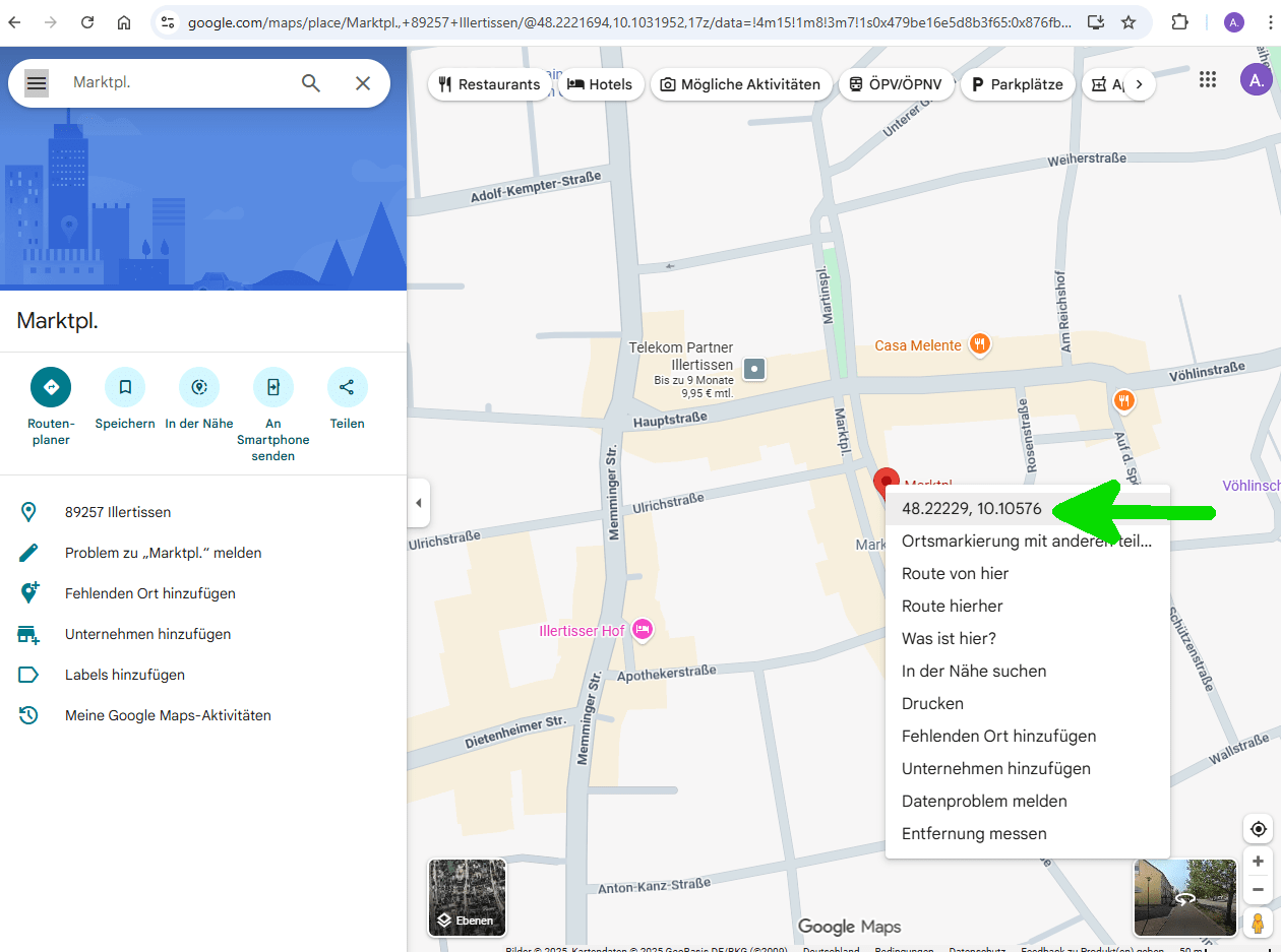 • Im kleinen Menü oben die Koordinaten mit linker Maustaste anklicken und kopieren.