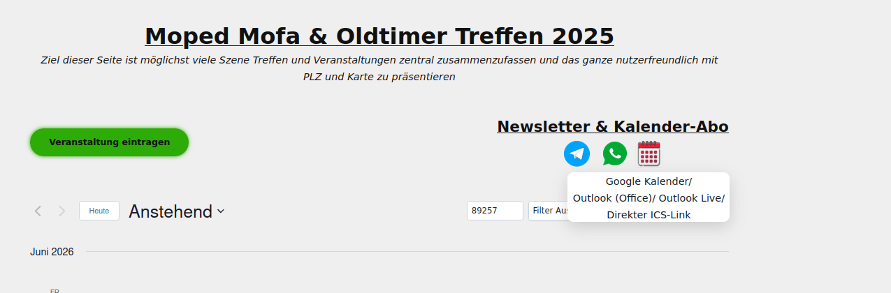 • Auf der Startseite oder Eventseite das Kalendersymbol unter „Newsletter & Kalender-Abo“ anklicken.